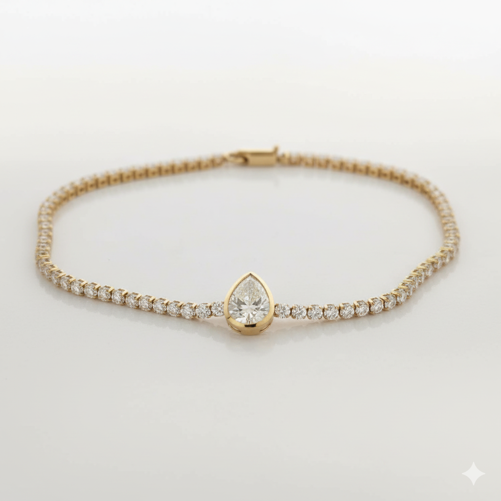 צמיד טניס יוקרתי ועדין בעיצוב אלגנטי, עשוי מזהב 14 קראט במשקל 2.7 גרם. הצמיד משובץ ב-70 יהלומים קטנים זוהרים ובמרכזו מתנוסס יהלום מרשים במשקל 1 קראט בצורת טיפה, המעניק לו נוכחות ייחודית וברק בלתי מתפשר. בסך הכול משובצים בצמיד 71 יהלומים במשקל כולל של 3.2 קראט, היוצרים שילוב מושלם בין עידון לנוכחות עוצרת נשימה. הצמיד מתאים לנשים שמחפשות תכשיט יוקרתי ונצחי - כזה שמחמיא הן להופעה יומיומית מתוחכמת והן לערב חגיגי. מתנה מרגשת ובלתי נשכחת, או פינוק מושלם לעצמך.